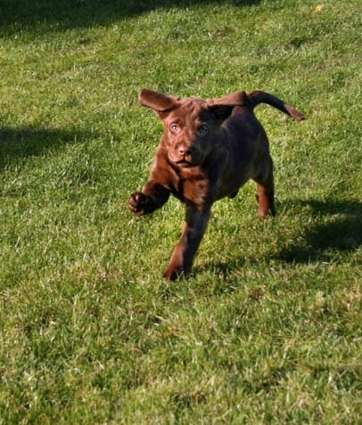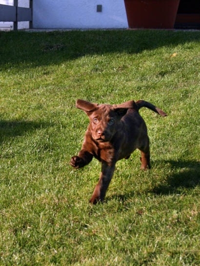 Schusstest: sicher, interessiert. Jugendlich wirkende 1 ½-jährige chocolate Hündin von sehr gutem Typ. Femininer Kopf mit süßem Ausdruck. Auge etwas rund. Sehr schöne Hals- und Rückenlinie. Vorhandwinkelung steil, Hinterhand noch korrekt. Mittlere Knochenstärke, Brustkorb noch in der Entwicklung. Flüssiger Bewegungsablauf, hinten etwas eng. Sehr offenes Wesen. Beim Schuss sicher und interessiert.