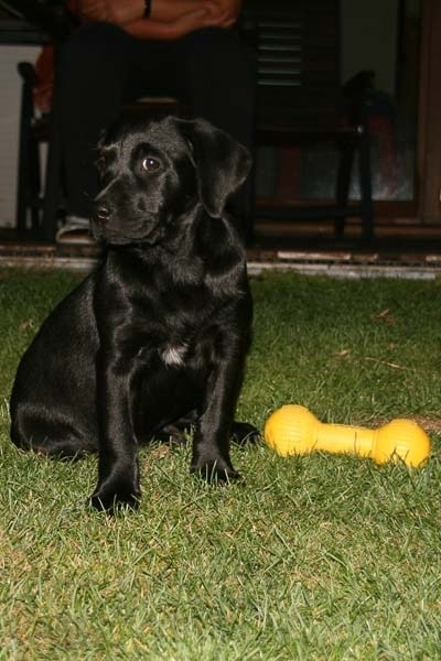 Die dreijährige Labrodaorhündin bewegt sich ruhig und gleichmäßig, immer in der Nähe ihrer Führerin, mit der sie gerne spielt.Sie ist mehr oder weniger unerschrocken, ihre Aufmerksamkeit gilt der Führerin. Beuteverhalten zeigt sie in erwünschtem Maße, hier sieht man auch sehr viel temperament. Sie ist sehr unterordnungsbereit, hat eine sehr enge Bindung. Fremden Menschen gegenüber ist sie sehr zurückhaltend, ein sehr kurzer Kontakt kommt zustande. Die Seitenlage schafft sie problemlos, die Gasse an der Seite ihrer Führerin. Schuss sicher. Den Parcour untersucht sie mit Führerhilfe. Eine im Umgang mit Menschen sehr zurückhaltende Hündin, die den Test mit ihrer Führerin besteht.